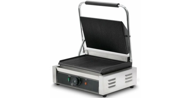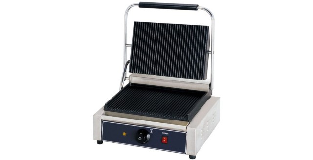 Одна зона нагрева; рифлёные чугунные верхняя и нижняя рабочие поверхности; 220 В; 1,8 кВт; 305 × 400 × 210 мм; 12,4 кг.