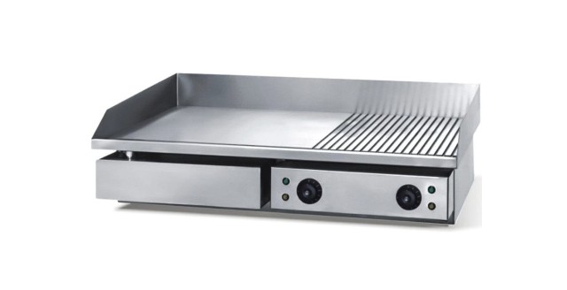 Комбинированная рабочая поверхность: 2/3 гладкая, 1/3 ребристая; температурный режим: 50…300 °С; 220 В; 4,4 кВт; 730 × 470 × 250 мм; 26,0 кг.
