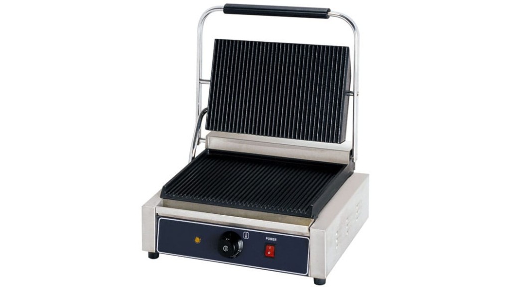 Одна зона нагрева; рифлёные чугунные верхняя и нижняя рабочие поверхности; 220 В; 1,8 кВт; 305 × 400 × 210 мм; 12,4 кг.